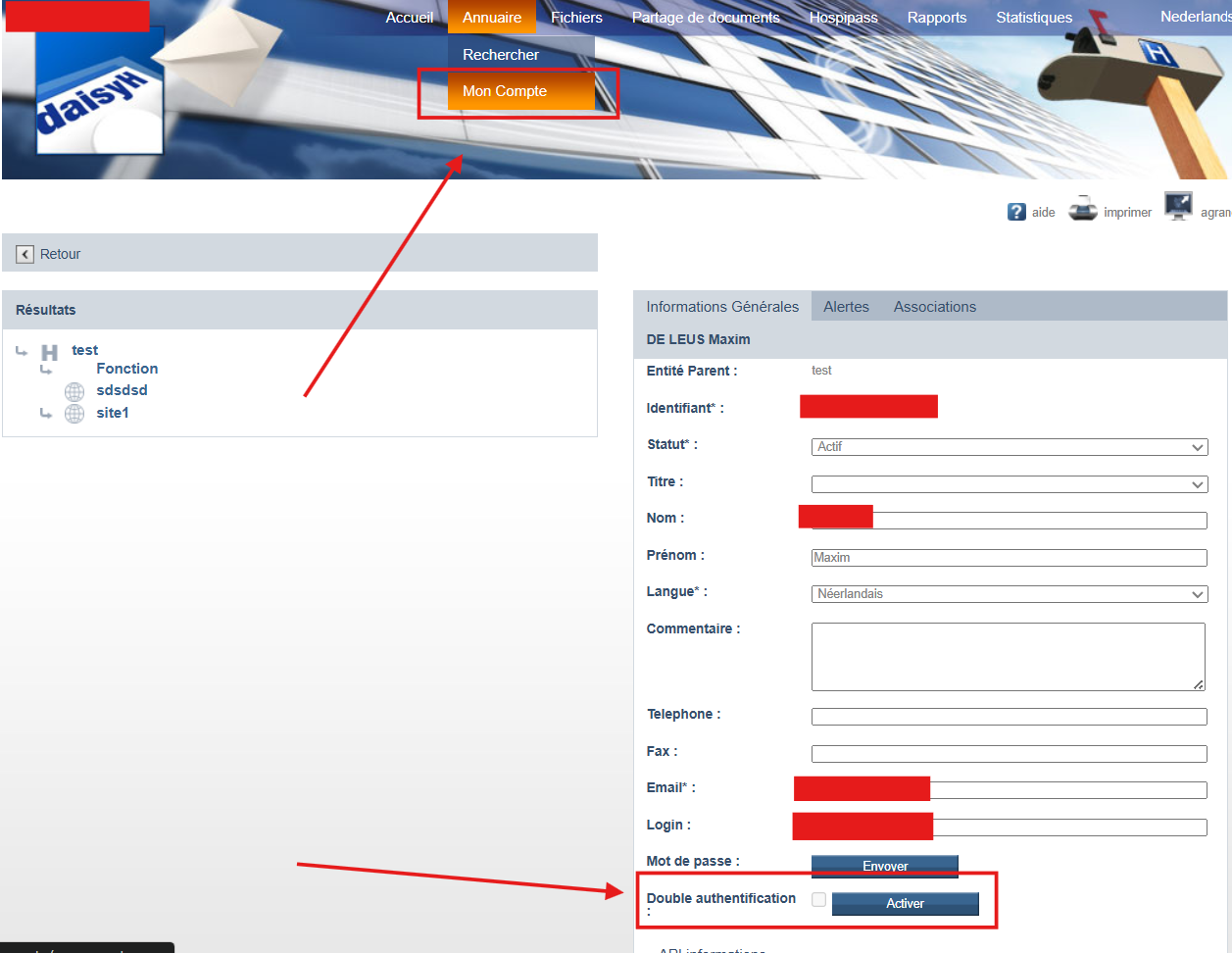 - Accédez à votre compte via Annuaire --> Mon compte. Vous verrez alors « double authentification » avec un bouton « Activer » à côté. Cliquez sur ce bouton.